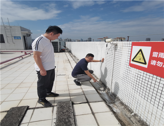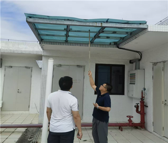 (现场检查楼顶排水系统和设施设备抗风能力)