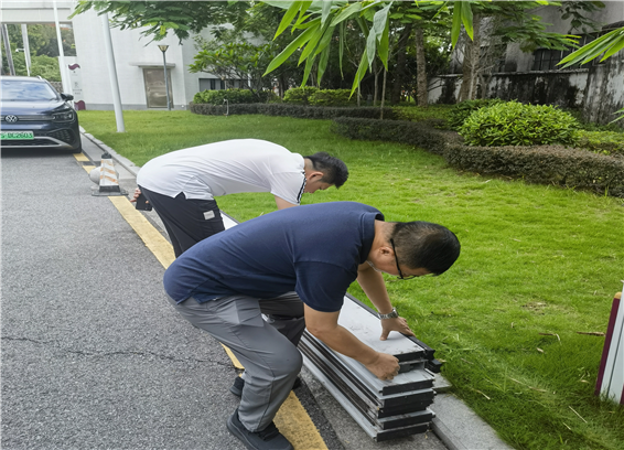 (台风来临前,疏导车辆有序驶离,关闭地下停车场防风门,确保地下供水供电和人防设施不受损)
