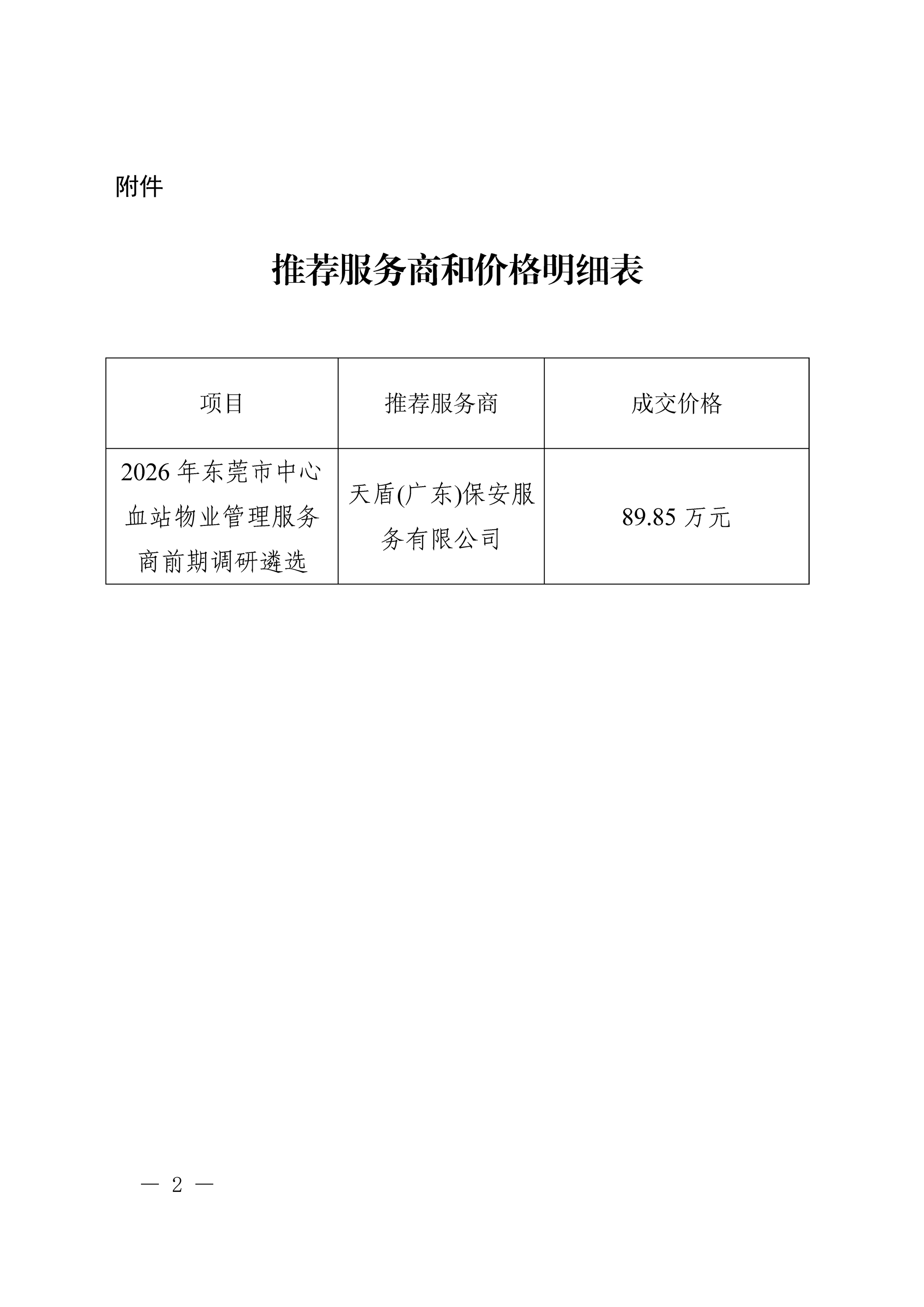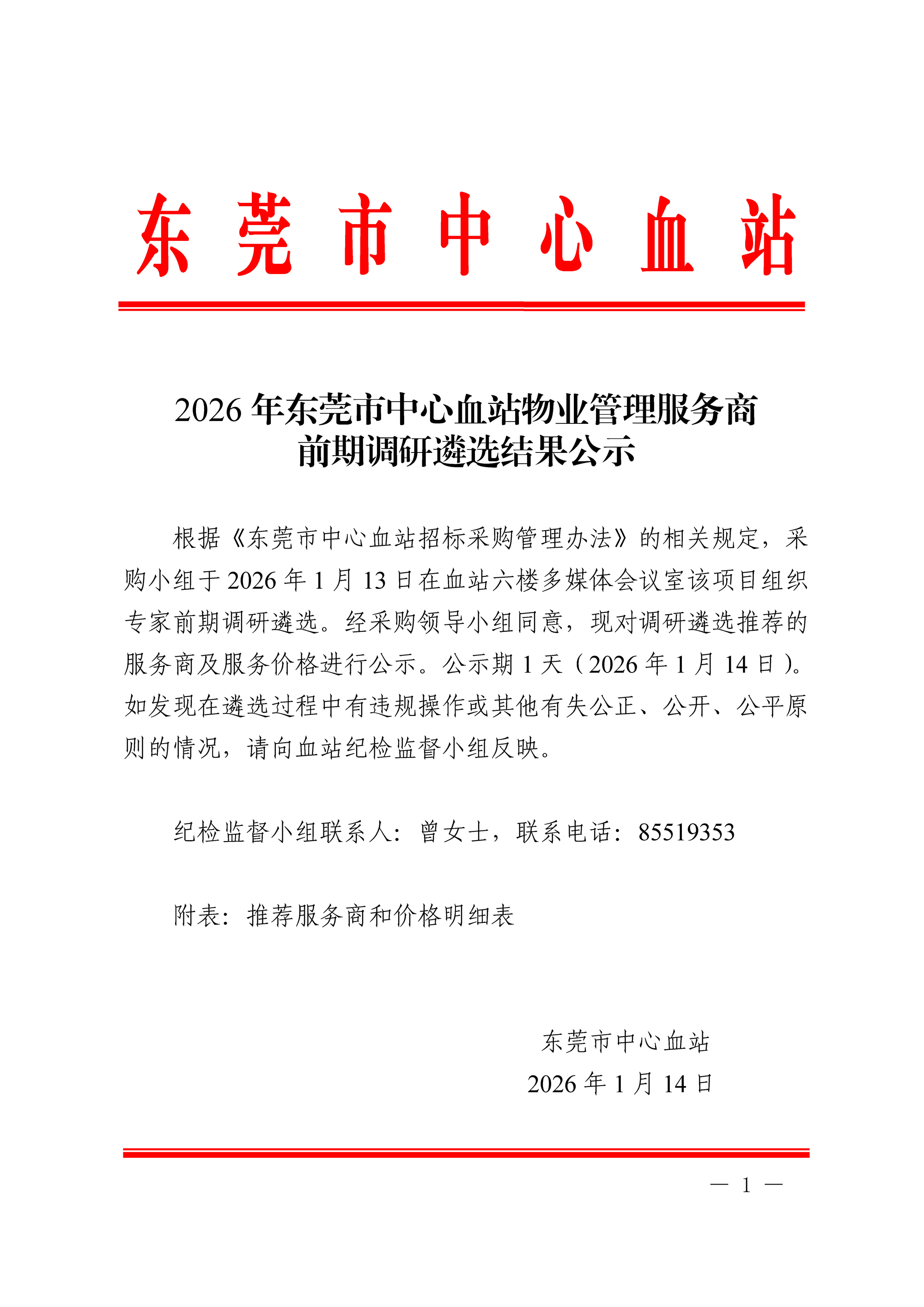 2026年东莞市中心血站物业管理服务商前期调研遴选结果公示