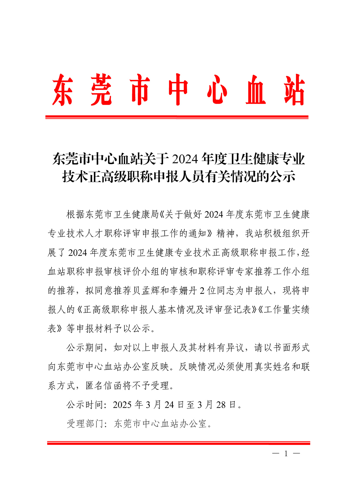 东莞市中心血站关于2024年度卫生专业技术正高级职称申报人员有关情况的公示