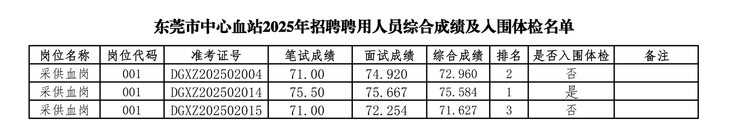东莞市中心血站2025年招聘聘用人员综合成绩与入围体检人员名单公告