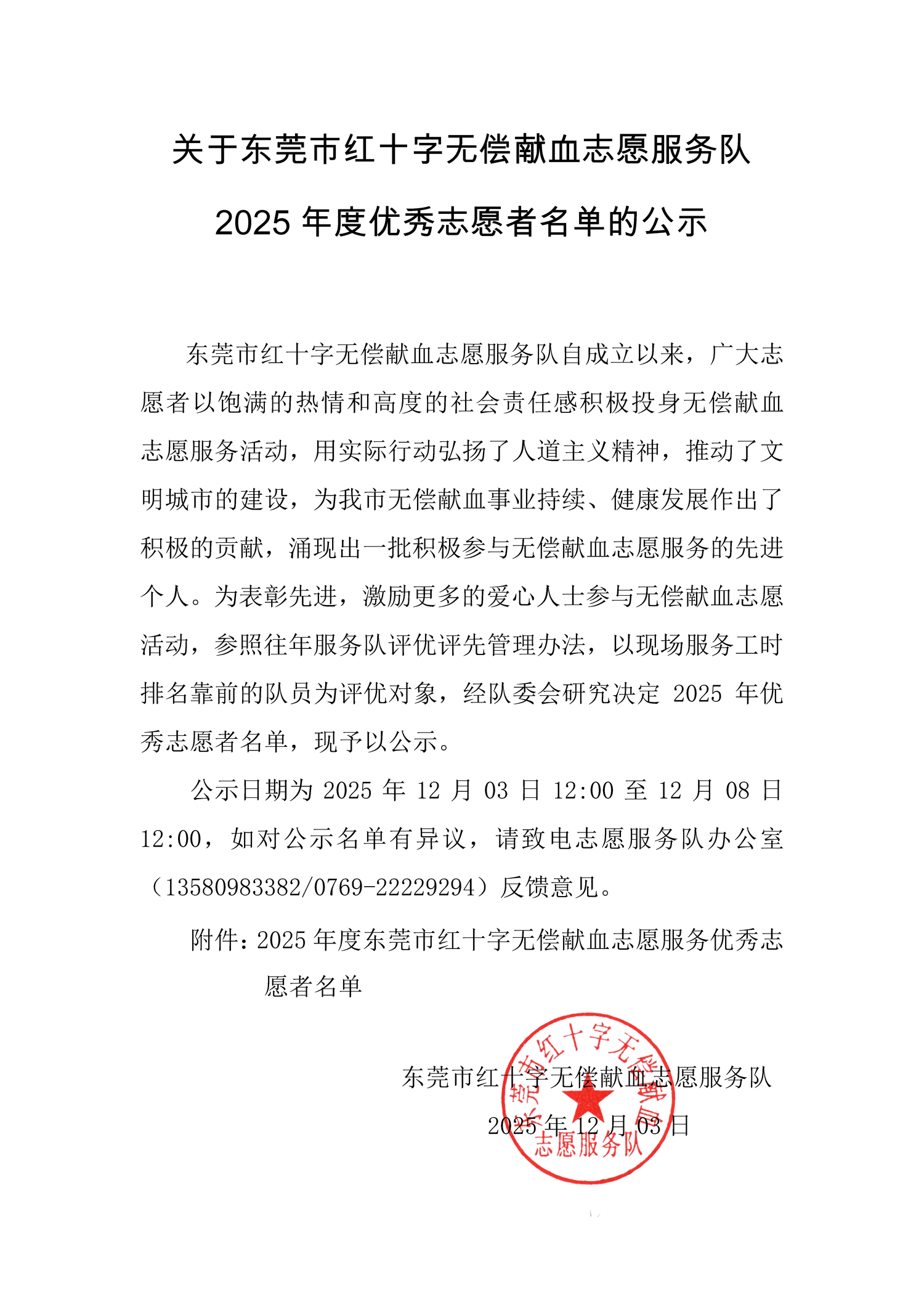 关于东莞市红十字无偿献血志愿服务队2025年度优秀志愿者名单的公示