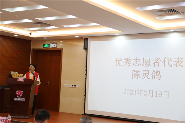 大会穿插了一项议程,为即将退出服务队的陈灵鸽(小草姐)安排了欢送仪式,由“小草姐”现场作志愿服务感言,并向她赠花和授予奖状。她用刚劲有力的声线,道出了人间大爱真情的肺腑之言“献血者永远不是孤身作战的一员,因为有我们的存在!”,在场所有志愿者为之鼓舞和感动!的确,“小草姐”自2016年加入服务队伍以来,服务工时达到2100余小时,尽管年过七旬了,但依然坚守志愿服务一线,用她硬朗的身板,抖擞的精神,清晰有力的言语表达,为众多的献血者提供服务,用行动诠释着大爱的真谛!在她的影响和带动下,年轻的献血者都纷纷加入了队伍当中。她,虽退出了,但精神可贵,将深深铭记在志愿者心中!