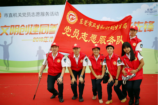 市卫生监督所党员志愿者在活动开幕式后参加了文明倡议签名,统一穿着“东莞机关党员志愿服务”红马甲,戴着红帽子,挥舞着党旗,结合单位工作职能,在旗峰公园设立的摊位上,举着“文明东莞,从我做起”主题宣传板,热情地为群众免费提供职业病防治、医疗机构监督、公共场所卫生以及传染病防治等知识咨询,向路过的市民派发各种宣传小册子。