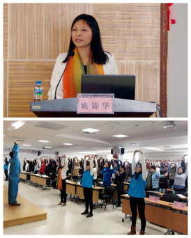 下午2点整,由来自常平社卫中心的姚锦华副主任给学员们分享在常平镇内各个社区筹划及推广八段锦-运动养生保健功的过程,并分析和展示了活动的亮点,给全市33个社卫中心在运动养生项目推广方面起到了一定的借鉴作用。并且组织学员们在大会现场集体耍八段锦,带动现场气氛,学员们的学习热情非常高涨,使午后略带疲倦的各位学员精神抖擞了起来。