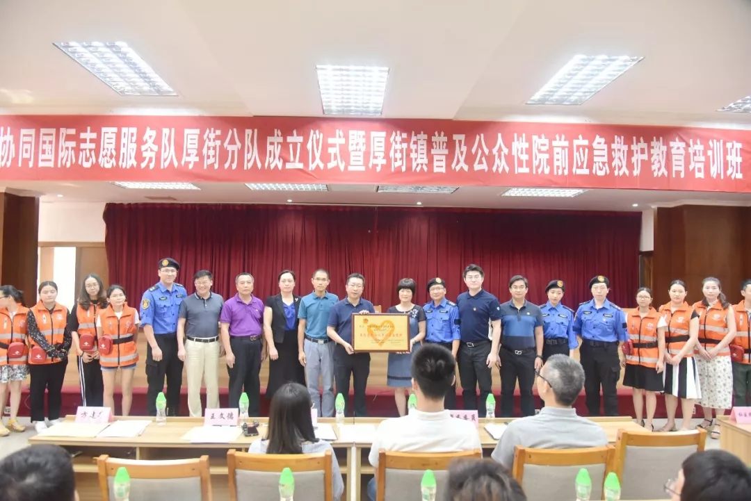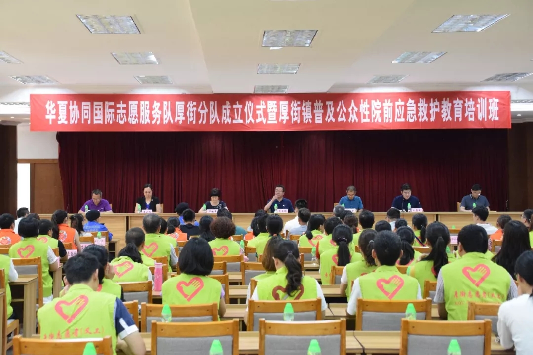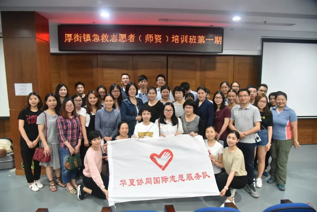 共青团东莞市厚街镇委员会、共青团厚街医院团委、厚街志愿者协会、华夏协同国际志愿服务队总队(广东省医疗大数据工程技术研究中心)共同组建了一支专业的急救志愿者队伍——华夏协同国际志愿服务队厚街分队。