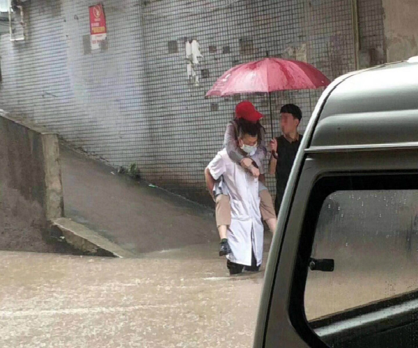 因为患者丈夫害怕搬运患者方式不对会加重患者病情,骆医生见此状马上背起患者,迎着湍急的水流前行数十米。“当时,水深已经到了我的膝盖,穿着的水鞋都进了水。”骆医生说。