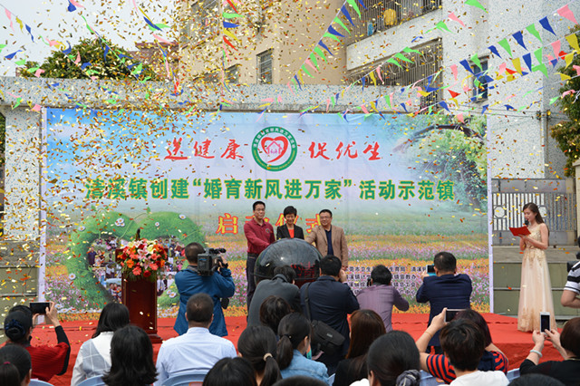 我市是婚育新风进万家活动第五阶段示范点,根据国家、省卫生计生委的指导意见,我局紧紧围绕年度主题深入开展宣传活动,切实将婚育新风进万家活动任务做细做实。今年我市选取了清溪镇作为东莞市婚育新风进万家活动创建工作示范镇,旨在通过示范镇的创建成效,引领全市婚育新风尚。3月13日,我市在清溪镇举行以“送健康、促优生”为主题的婚育新风进万家活动启动仪式,市卫生计生局副局长、党组成员叶润娣、副调研员宋洪南、清溪镇副镇长卓益昌以及市、镇有关部门单位负责人、各村(社区)群众代表等共约200人参加了活动。