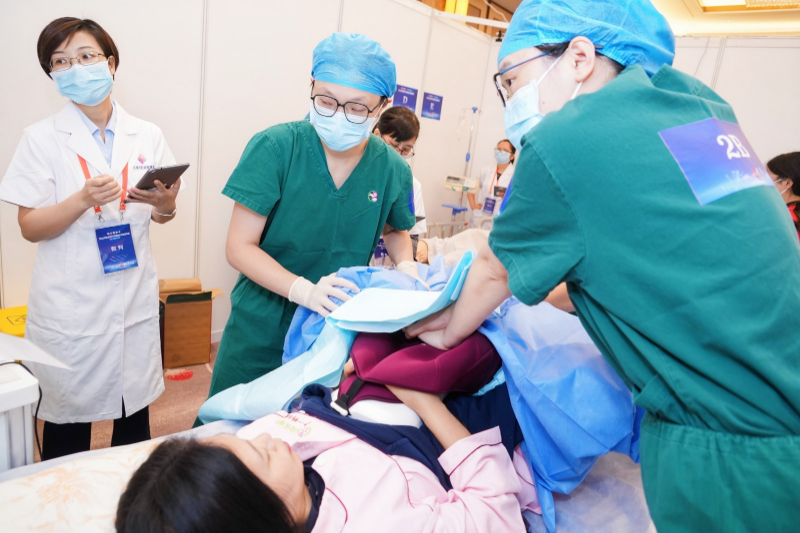 比赛现场设置了5个考站,共14个考点,主要围绕肩难产、子宫内翻、新生儿复苏、宫腔填塞、内倒转臀牵引、紧急宫颈环扎、阴道助产、剖宫产出血止血、促宫颈成熟等专业技能操作项目出题,模拟产房分娩的真实场景。