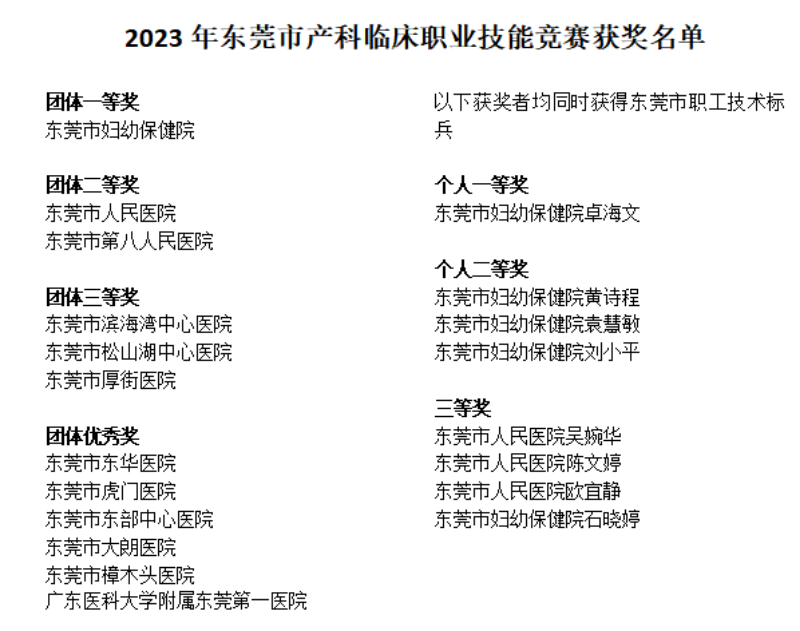 东莞市妇幼保健院获得团体赛一等奖,东莞市人民医院、东莞市第八人民医院获得二等奖,东莞市滨海湾中心医院、东莞市松山湖中心医院、东莞市厚街医院获得三等奖,东莞市东华医院、东莞市虎门医院、东莞市东部中心医院、东莞市大朗医院、东莞市樟木头医院、广东医科大学附属东莞第一医院获得团体优秀奖。