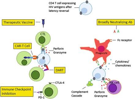 免疫疗法是指通过人为调节机体的免疫功能,达到抑制病毒,控制疾病进展的目的。作为新兴技术,免疫疗法已应用于自身免疫病、肿瘤、器官移植等多个领域,并取得了较好的治疗效果。已用于艾滋病领域的免疫疗法包括治疗性疫苗、广谱中和抗体、HIV-1特异性T细胞治疗、CAR-T细胞治疗、免疫调节治疗等。免疫疗法在灵长类动物模型中能够有效控制病毒储存库,抑制停药后的病毒反弹。然而现有研究结果表明,仅仅采用一种免疫治疗方法很难完全抑制宿主体内病毒,甚至有加速突变毒株的复制和耐药的风险。几种免疫疗法联合应用策略可以大大减少这种情况发生,有利于达到功能性治愈的目的。