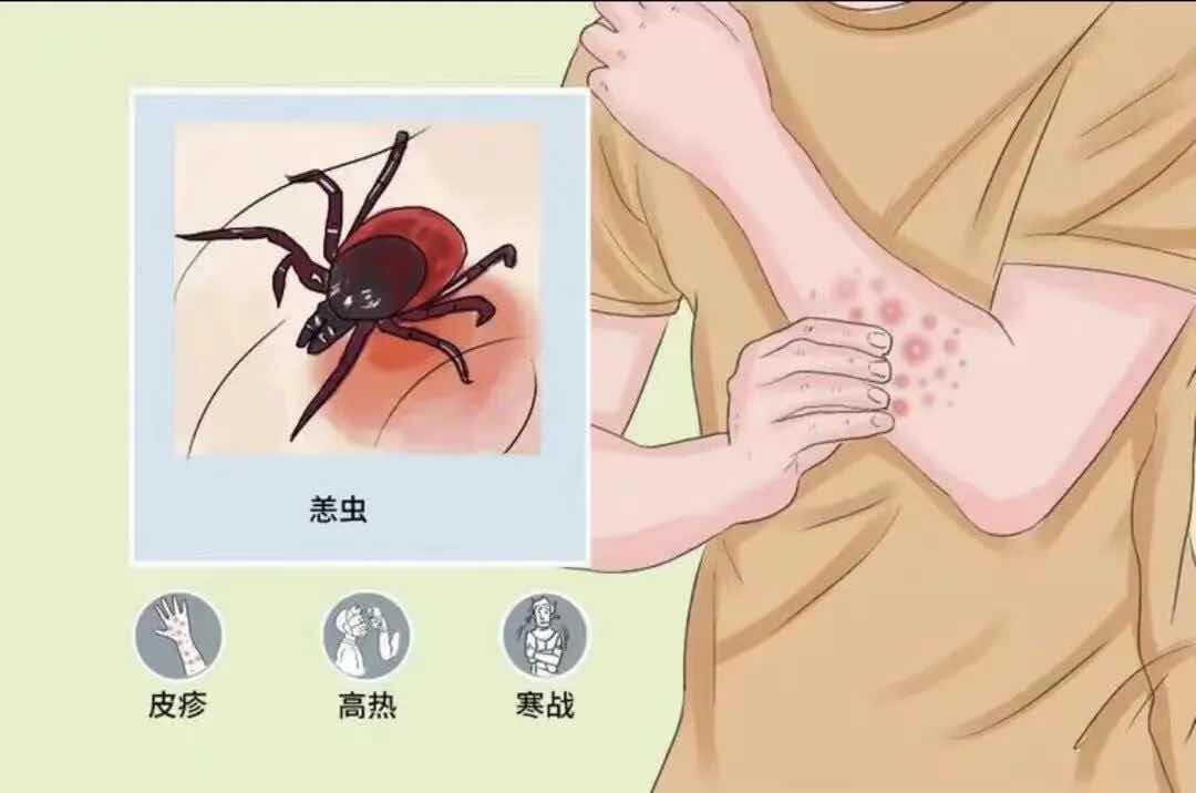 被恙螨幼虫叮咬后如果患了“恙虫病”,除了皮疹,患者还会出现持续高热(温度可达38.5—41℃),皮肤受刺叮处有焦痂或溃疡,局部或全身浅表淋巴结肿大;严重者甚至引发死亡。潜伏期4—20天,多急性起病。若救治不及时,常诱发多器官功能衰竭而危及生命。