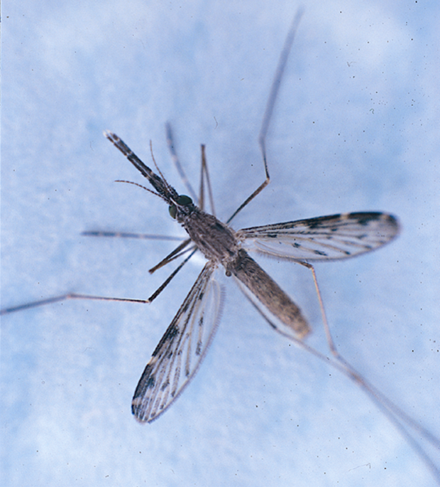 按蚊外观形态(成蚊):翅膀上有黑白斑,大多灰色;下颚须长;停落时尾翘。