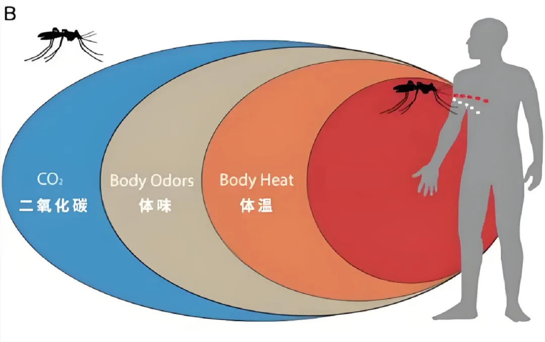 人体会散发热量,就像发射红外信号,能被蚊子识别,使得蚊子在黑暗或视线不佳的环境中也能准确找到叮咬对象。