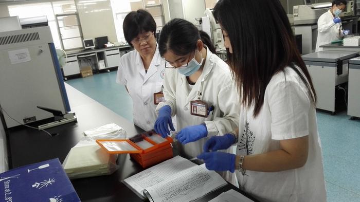 图1:市疾控中心督导人员在基层检验科核查疟疾血片制作情况