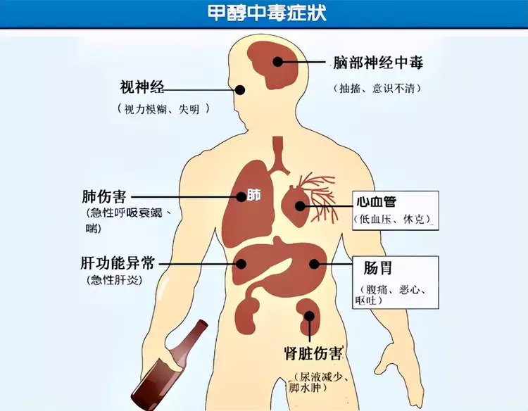 甲醇的香气类似酒精,味道也和酒精难以辨别,但其价格只有酒精的三分之一,原料价格差导致不法分子利用它冒充酒精兑制成假酒贩卖。按照我国现行的关于蒸馏酒和配制酒的标准《食品安全国家标准蒸馏酒及其配制酒》(GB2757—2012)中的规定:每100毫升以谷类为原料的酒中甲醇含量不得超过0.036克,而假酒中的甲醇含量远高于国家标准,在不知情的情况下饮入这种酒以后,会出现眩晕、头痛、耳鸣等症状,严重时会头痛恶心,呼吸困难,昏倒乃至殒命。