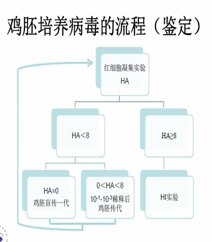 流感病毒一般采用尿囊腔接种和羊膜腔接种。接种的材料为患者含漱液、咽拭子样本,震荡混匀并加抗生素进行处理;取9~12d龄发育良好的鸡胚,将处理过的样本液在羊膜腔和尿囊腔各接种0.2ml;每份样本3~4只鸡胚,置33~35℃温箱培养,甲型流感病毒一般培养48h,乙型流感病毒培养72h;鸡胚4℃放置过夜(或-20℃放置1h)后分别收获尿囊液和羊水,并作红细胞凝集试验(HA)。通过HA检测流感病毒的血凝滴度,如血凝阴性,可盲传2代,如仍为阴性则可弃之;如具有一定的HA滴度即可进行血凝抑制试验(HI)进行流感病毒型别的鉴定。