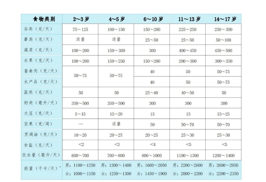 每日摄入的食物要适量,根据儿童青少年生长发育及身体活动水平进行适当调整。不同年龄段正常体重儿童青少年每天各类食物建议摄入量及中等强度身体活动水平的能量需要量见下表。
