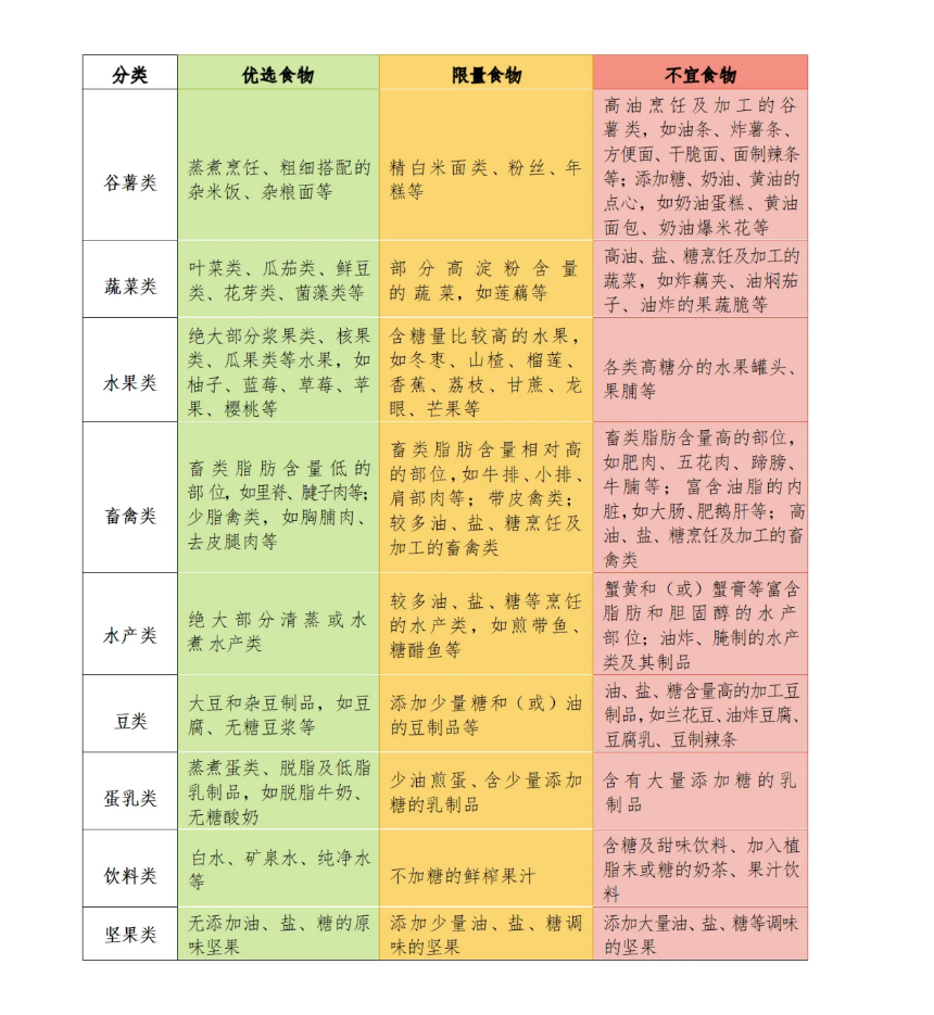 选择能量较低、微量营养素密度较高和血糖生成指数较低的食物,少吃高油、高盐和高糖及能量密度较高的食物。各类食物选择举例见下表。