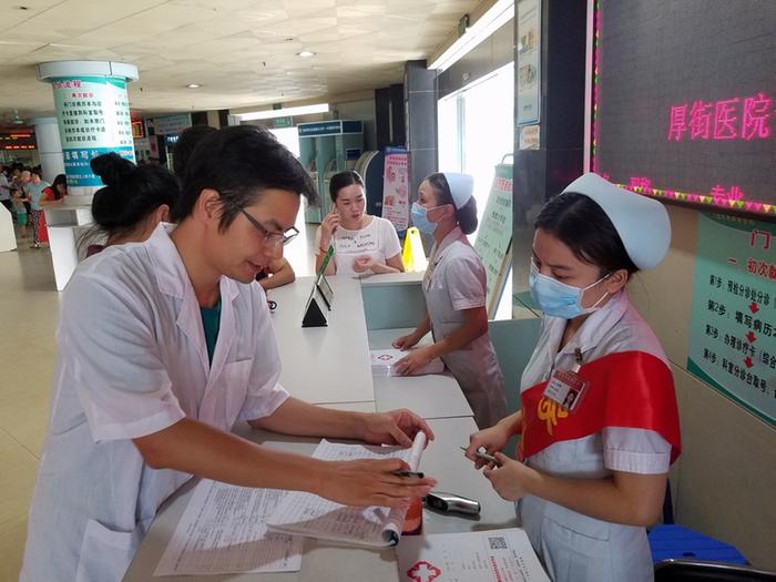 志愿者为医院导诊护士耐心解释发热病人登记的注意事项
