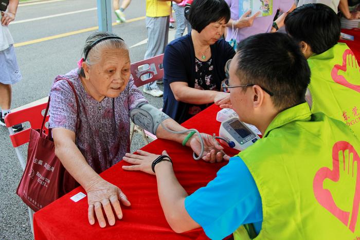 图:志愿者在东城虎英公园现场测血压