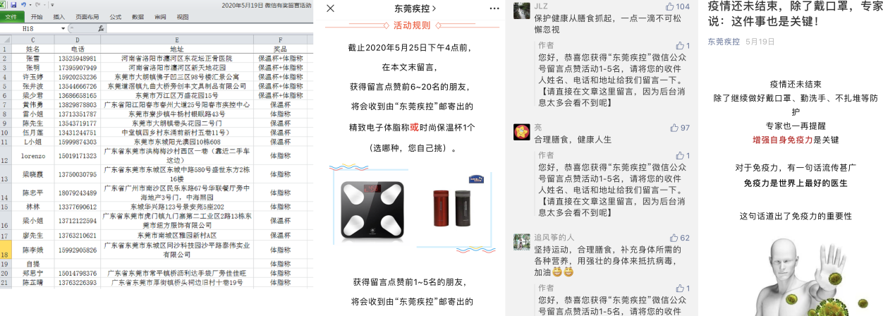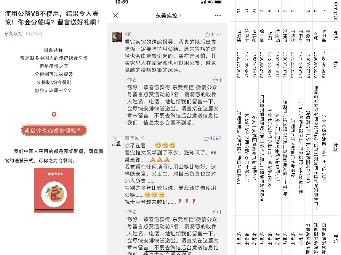 为切实开展好本次活动,除了在中心内张贴海报、分发宣传手册以及在中心业务综合楼一楼大堂电子屏投放营养相关视频并全天滚动播放外,我们在自己的门户网站中“健康主题—食品安全与环境卫生专栏”刊登营养健康相关的小视频。同时我们还充分利用“东莞疾控”微信公众号的影响力,开展了两场微信推文留言点赞有奖宣传活动,一是5月18日的“健康生活习惯类”微信推文《使用公筷VS不使用,结果两人震惊!你会分餐吗?留言送好礼啊!》,二是5月19日的“营养膳食类”微信推文《疫情还未结束,除了戴口罩,专家说:这件事也是关键!》,微信推文活动结束后,我们给中奖的市民邮寄了精美的礼品,广泛进行宣传,普及营养健康知识。