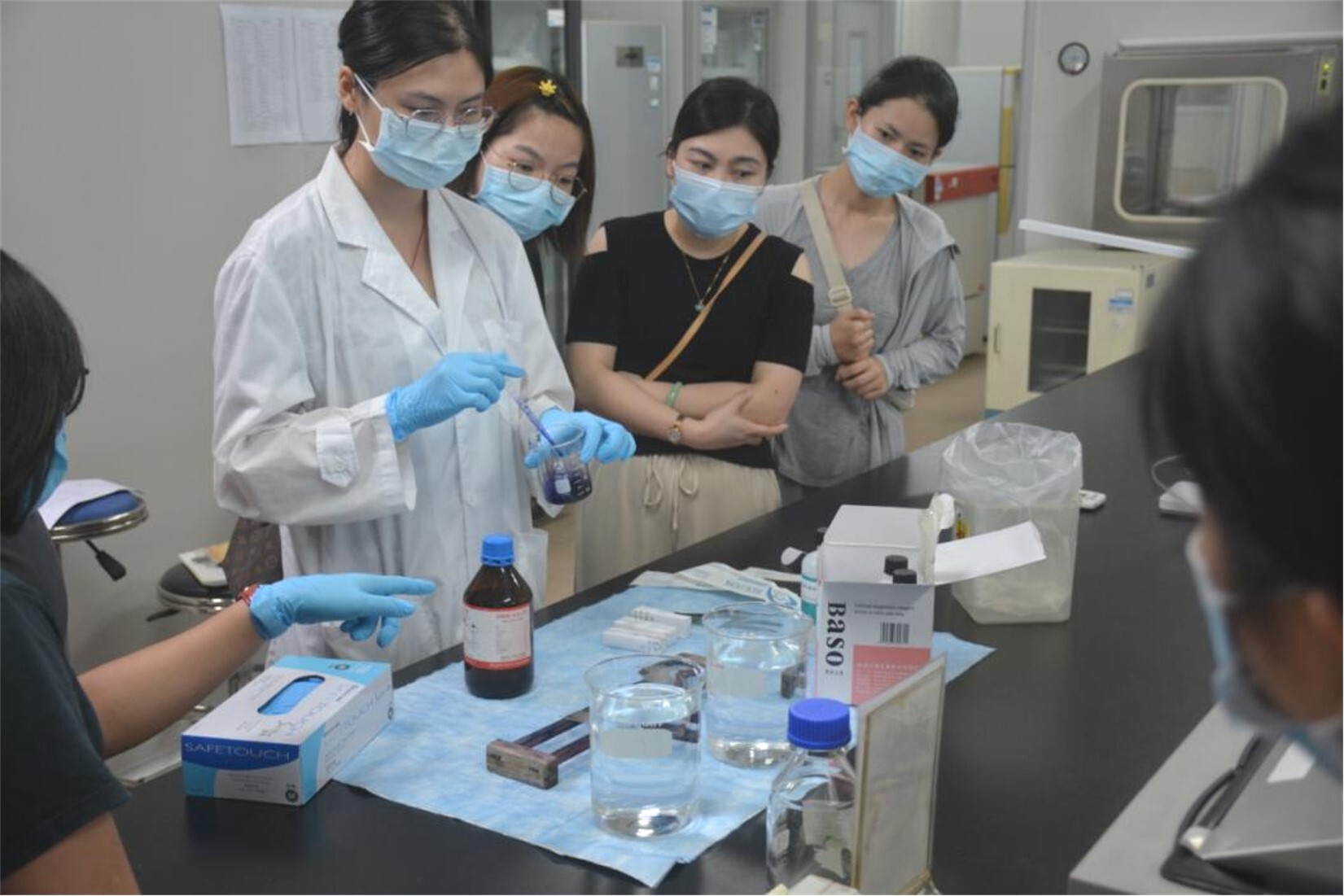 图5市疾控中心微检验何颖欣主管技师对检验人员开展疟原虫血涂片制作教学及实操考核