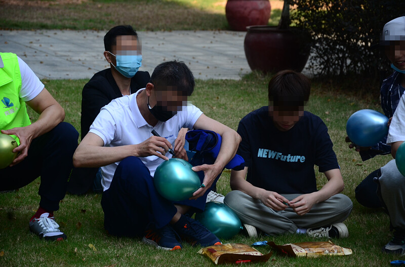 上午10点,运动会准时开始。首先开展的是一个“九宫格”的破冰项目,大家通过寻找信息、交流互动和相互介绍从而加深认识。接着进行的热身游戏“击鼓传花”“点墨游戏”让运动员们在欢快的气氛中放下心理上的防御,敞开心扉畅所欲言。其中团体游戏“无敌风火轮”更是将运动会推向高潮,感染者和工作人员自行分为四组,组员们将报纸做成圆形,全体组员站入其中,并以车轮的形式向前行走,一边行进一边喊着团队口号加油,场面非常热烈祥和。最后,组员们通过气球传情,送祝福,表心声,活动在一片欢乐声中圆满结束。