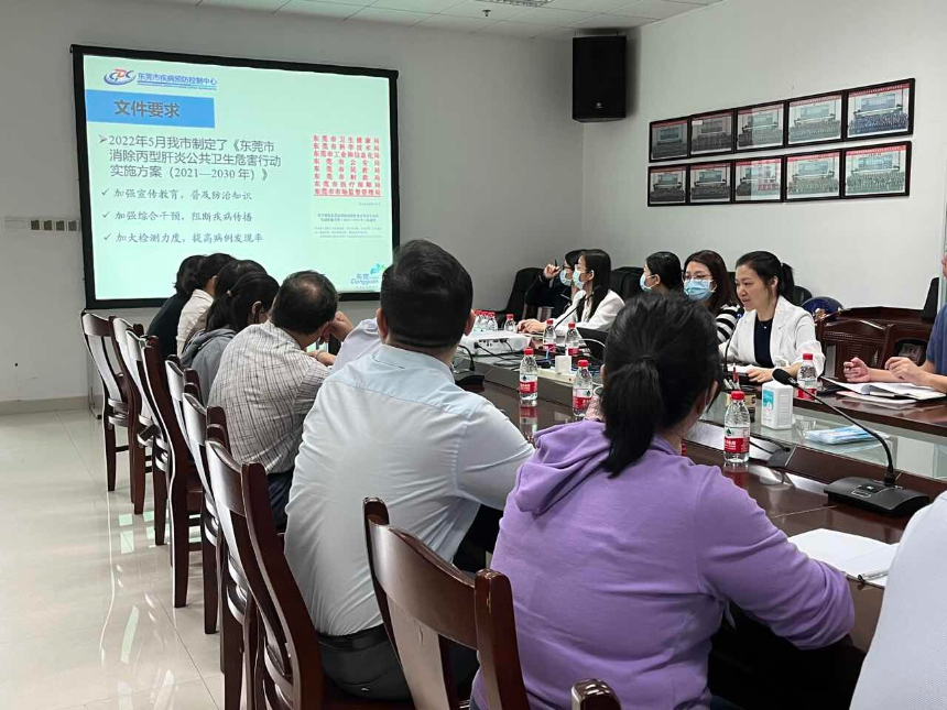 为贯彻落实《东莞市消除丙型病毒性肝炎公共卫生危害行动实施方案(2021—2030年)》,进一步加强和规范丙肝治疗工作,我市于4月25日在市疾病预防控制中心召开了2023年丙型病毒性肝炎治疗工作推进会。市卫生健康局疾控科三级主任科员曾耀明和9个定点治疗机构医务科、感染科、防保科及定点治疗机构所在镇街疾病预防控制中心的专业人员共40余人参加了此次会议。
