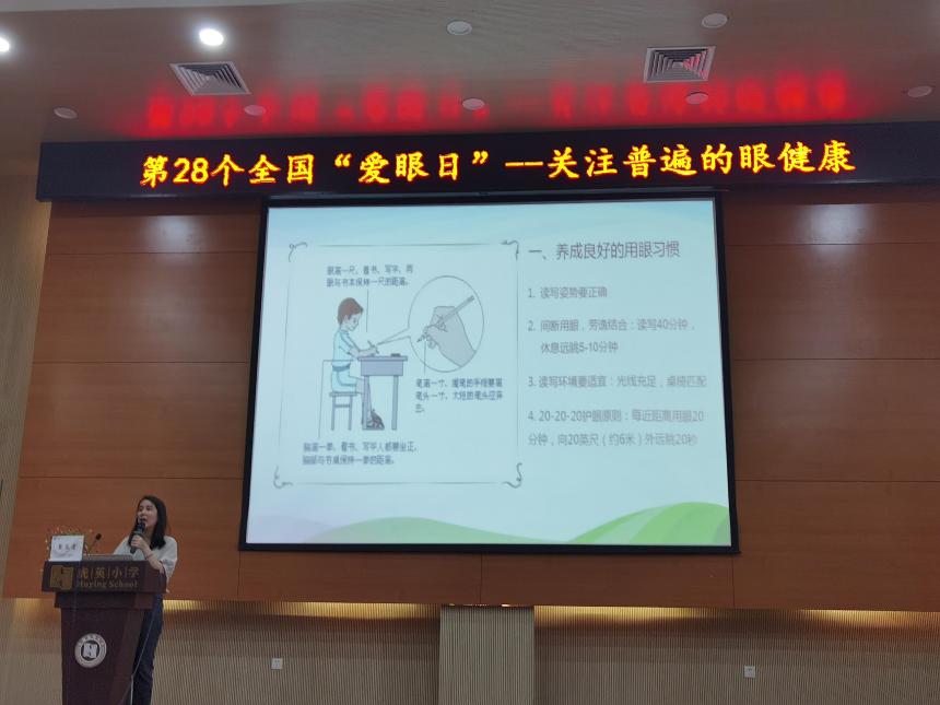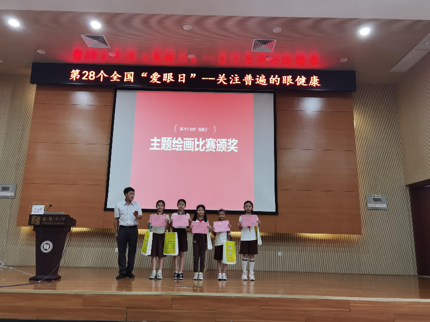 活动分为科普讲座、“爱眼护眼”绘画比赛颁奖和爱眼小屋活动3个部分。讲座由东莞市人民医院副主任医师萧玉莹讲授,萧主任用通俗易懂、生动活泼的语言给现场师生讲解了眼睛结构、让眼睛远离意外伤害和预防近视等相关知识,指导学生如何保护爱护眼睛。接着,我中心学校卫生所所长黄岸仲、东城街道卫生健康局副局长刘丽华及虎英小学校长阮美好等专家领导对在“爱眼护眼”主题绘画比赛中获奖的同学进行颁奖。最后,现场参加活动的师生一起到虎英小学爱眼小屋进行“学习正确坐姿”、“屈光筛查”和“视力检测”等体验活动。