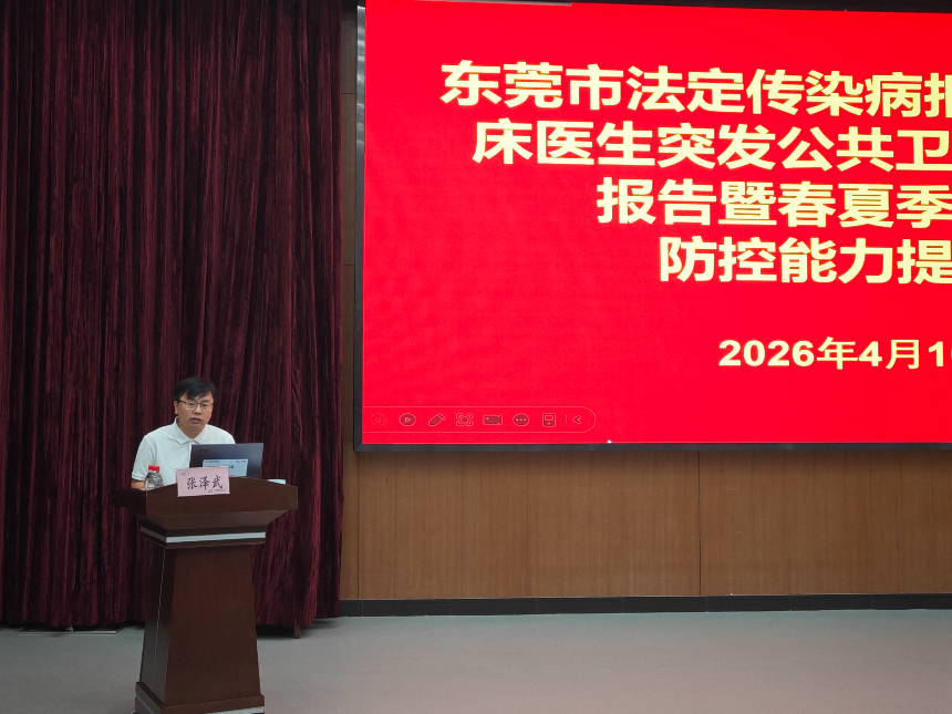 为做好我市登革热和基孔肯雅热、手足口病、诺如病毒感染等春夏季重点传染病防控工作,规范我市传染病及突发公共卫生事件报告流程,提高我市临床医务人员传染病早期发现和识别能力,2026年4月16日我中心举办“东莞市法定传染病报告管理与临床医生突发公共卫生事件发现报告暨春夏季传染病防控能力提升班”,各市属医院、镇街医院、镇街(园区)疾控中心及综合性民营医院从事医疗、传染病防控工作技术骨干共270余人参加了本次培训。