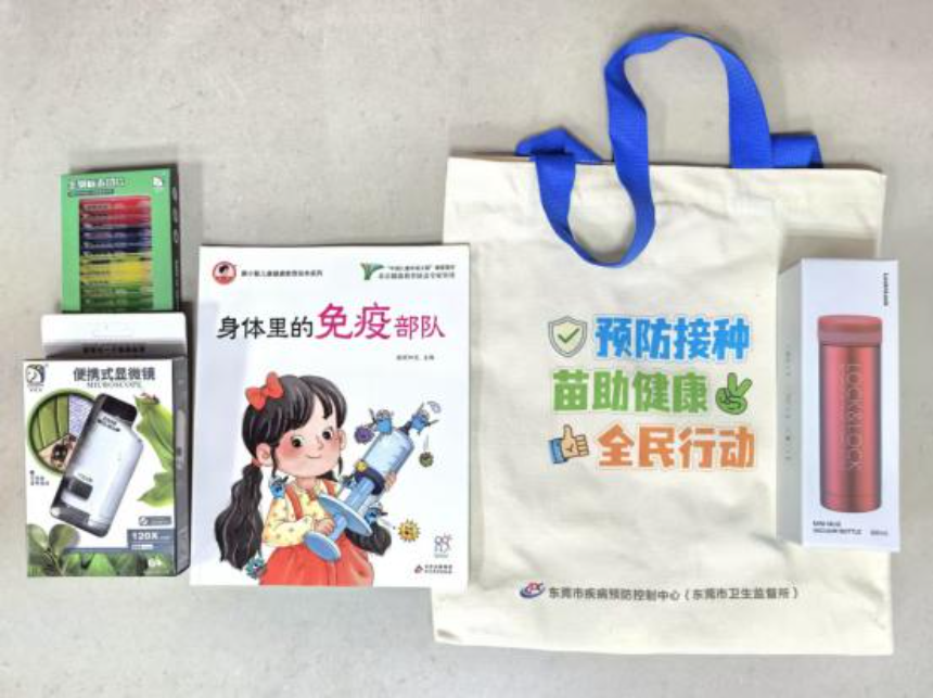完成所有打卡任务的小小疫苗勇士,统统抱走惊喜大礼包——儿童健康科普绘本、便携式户外显微镜(含多张玻片)、品牌水杯、免疫超人环保袋……