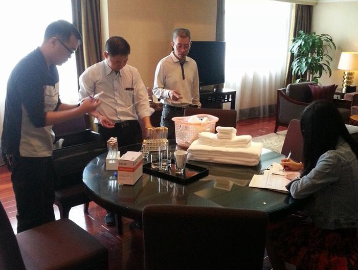 我中心姚旭芳副主任亲自带队,指导公共卫生保障小组对22所博览会指定接待酒店的客房毛巾、茶杯、微小气候、二次供水、空气细菌总数、酒店冷却塔冷却水及游泳池水质进行检测,以评价酒店的卫生情况。通过对接待酒店开展卫生监测检查工作,有效督促接待酒店加强公共卫生工作,全力保障2015广东21世纪海上丝绸之路国际博览会的顺利举办。