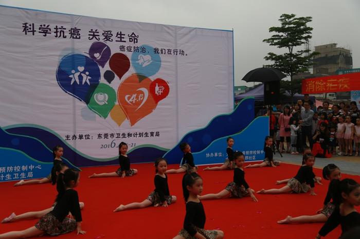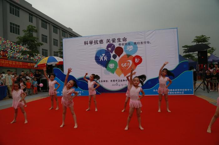 宣传现场人头涌涌,气氛热烈。由大朗小英豪幼儿园活泼可爱的小朋友带来的动感十足、活力四射的《123运动操》拉开了本次活动序幕,接着松柏朗社区的阿姨和小朋友们用轻盈的舞步、曼妙的舞姿带给观众一场特殊的视觉盛宴。表演结束后,现场的有奖问答和互动游戏环节引来了新一轮的活动高潮。现场工作人员把肿瘤防治知识通过一个个小游戏和健康知识抢答等方式向大众进行普及。
