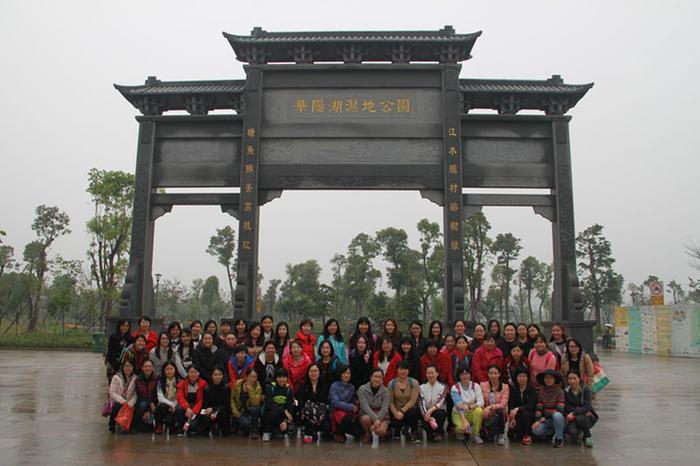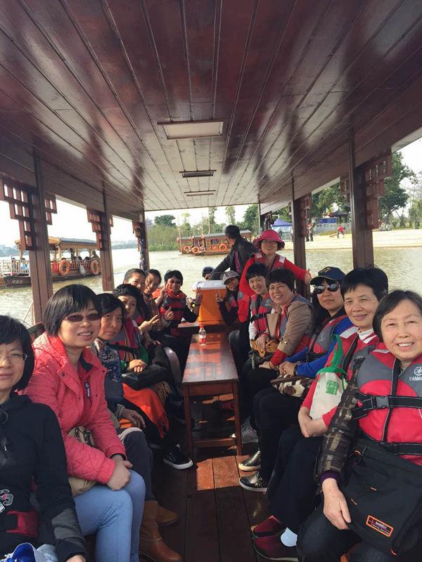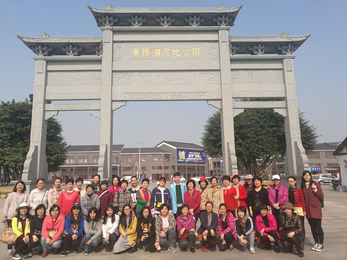 到达华阳湖湿地公园后,大家首先坐上游船在湖里游览约6公里的花海。和煦的春风轻抚着大家的发丝,波光粼粼的湖水拍打着两边的湖岸,五颜六色的鲜花争先开放。远处,华阳塔耸立在湖边,挺拔英俊的身姿倒映在湖面上,配上当天烟雨朦胧的天气,犹如隔着一层薄薄的白纱,更是别有一番滋味在心头。游船后,妇女们有的在湖边漫步赏花,吸收负离子,有的静静地享受着风景区内的一切美景,有的三五成群谈笑风生,有的拿出相机,按下快门,咔嚓一下,将那一道道美丽的景色、那一张张洋溢着轻松快乐笑容的脸,逐一定格在相机里。