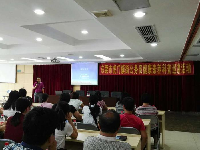 9月20日下午,东莞市公务员健康素养科普巡讲活动在虎门镇拉开帷幕。本次活动由东莞市疾控中心(市健康教育所)主办,虎门镇疾控中心(镇社卫中心)承办,参加人员为虎门镇各机关单位公务员约100人;虎门医院张光正主任医师作“亚健康状态康复预防”专题科普讲座,虎门镇社区卫生服务中心吴小勇副主任医师作“退行性变”专题科普讲座;东莞市科学技术协会科普部部长黎鹤龄同志和东莞市疾控中心(市健康教育所)项目负责人张小红同志亲临现场指导工作。