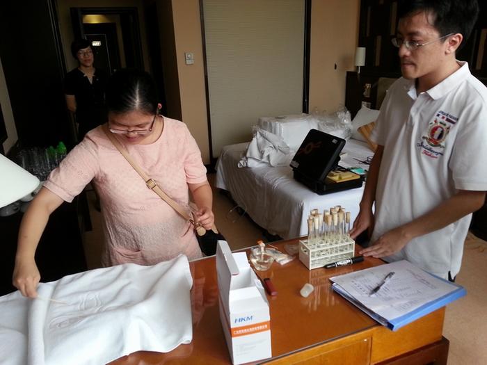 工作人员对毛巾进行采样