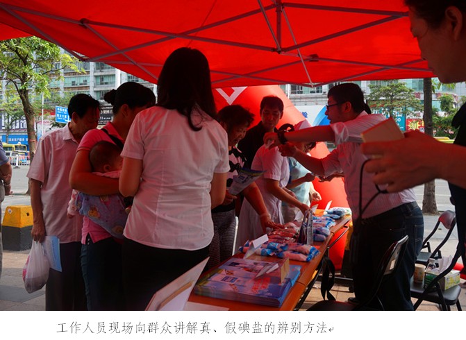 为了普及碘缺乏病防治知识,进一步增强群众对碘缺乏病防治知识的认识,5月15日上午,由市卫生局牵头,市发改委、市教育局、市人口计生局、市工商局、市质监局、市广电局、市妇联、市残联、市关工委、市盐务局等多个部门联合在南城蒙莱广场举行东莞市“防治碘缺乏病日”宣传活动。活动现场通过张贴宣传画、悬挂横幅、发放宣传单和小册子、专家咨询、等形式,就碘缺乏造成的危害、预防碘缺乏病、真假碘盐辨别、食用碘盐的注意要点等方面进行了宣传。本次宣传活动各部门共出动了40余人,悬挂横幅2条,制作宣传版面4块,共接待群众500余人,发宣传资料1000多份。我中心派出了专业技术人员参与了本次宣传活动,并在现场接受群众咨询,解答群众提出的疑难问题,向群众讲解了碘缺乏病的相关知识。