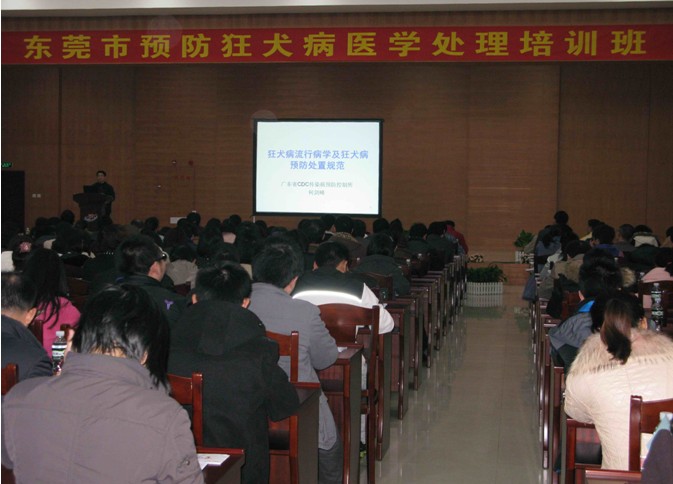 卫生部《狂犬病暴露预防处置工作规范(2009版)》要求,从事狂犬病暴露预防处置的医务人员须经卫生行政部门培训考核合格后,方可上岗。为进一步提高我市各狂犬病监测点及社区卫生服务中心相关人员的狂犬病医学处理水平及疫情处置能力,更好地控制狂犬病疫情,切实保障广大群众的身体健康和生命安全,市预防医学会和市疾病预防控制中心于3月1日下午联合举办了一期“东莞市预防狂犬病医学处理培训班”。全市各有关医院卫生机构从事狂犬病暴露后处理的专业技术人员共320余人参加了培训。