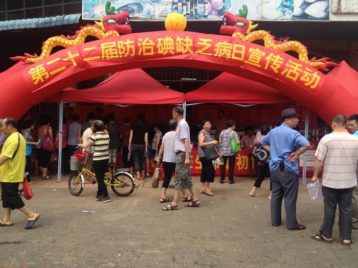 为了普及碘缺乏病防治知识,引导群众主动、科学补碘,5月15日上午,由市卫生计生局牵头,市发改局、市教育局、市盐务局、市文广新局、市食品药品监管局、市妇联、市残联、市妇儿工委、市关工委等多个单位部门联合在莞城街道细村市场开展“防治碘缺乏病日”宣传活动。活动现场通过张贴宣传画、悬挂横幅、发放宣传单和小册子、专家咨询等形式就碘缺乏造成的危害、预防碘缺乏病、真假碘盐辨别、食用碘盐的注意要点等方面进行了宣传和解答。本次宣传活动各部门共出动了30余人,悬挂横幅2条,制作宣传版面6块,共接受群众现场咨询800余人,发宣传资料1200多份。