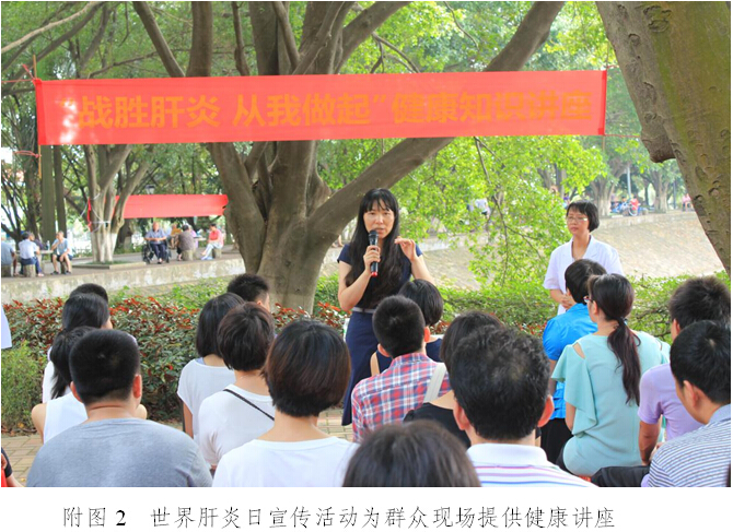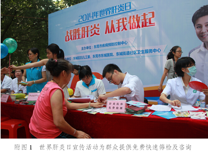 世界卫生组织将每年的7月28日作为世界肝炎日,各国也据此制订不同主题,2014年,中国的宣传主题是“战胜肝炎,从我做起”。为提高我市居民对病毒性肝炎的认知,7月26日,东莞市疾病预防控制中心联合东城街道妇儿工委、东城医院、东城社区卫生服务中心在虎英公园举办了世界肝炎日宣传活动。