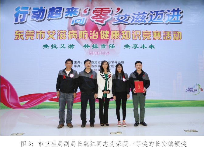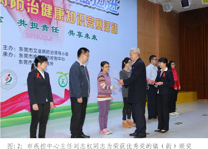 2013年“世界艾滋病日”系列宣传活动之一??东莞市艾滋病防治健康知识竞赛暨颁奖仪式于2013年12月6日在市疾病预防控制中心隆重举行并完满完成。本次竞赛活动主题为“行动起来 向零艾滋迈进”,由东莞市艾滋病防治工作领导小组主办,东莞市疾病预防控制中心、东莞市健康教育所承办。