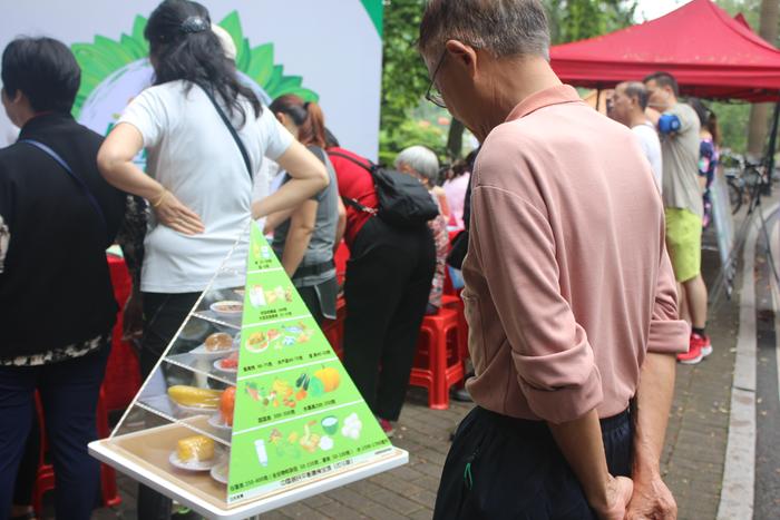 5月22-28日为“健康中国行”广东省宣传活动周,今年主题是“合理膳食”。现场通过设置背景板、摆放展板、膳食宝塔展示架和派发折页等多种形式营造了良好的宣传气氛,活动现场免费为居民提供测量血压、血糖和测量骨密度、体脂,还安排了中医科、内科、疼痛科等专家为市民提供专科咨询等服务。活动中,医务人员通过膳食宝塔展示台向居民宣传最新版的中国居民营养膳食指南,并将其概括为:“食物要多样,杂食最健康!谷类为首选,蔬菜水果不能忘!鱼肉蛋禽要适量,奶类大豆要跟上!少盐少油多喝水,控糖限酒不过量!吃动平衡控体重,卫生节约最时尚!”。