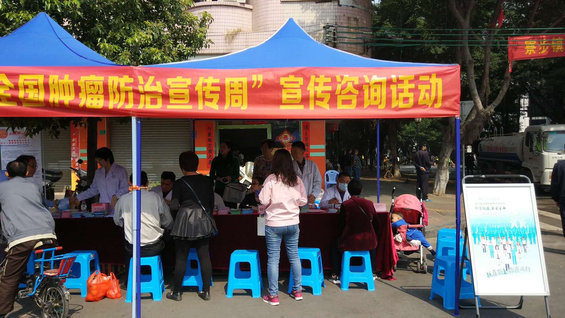 同时,市内各医院、各镇街(园区)社区卫生服务中心(疾病预防控制中心)也利用各自的优势,积极多种多样的开展肿瘤宣传,如在显眼位置张贴肿瘤宣传海报、在相关科室派发肿瘤宣传资料;利用电子LED屏24小时滚动播放肿瘤宣传知识,让群众路过或候诊期间也能接收防癌资讯;派出专业医务队伍到辖区的小区、企业、公园等场所开展肿瘤预防讲座、主题宣传义诊活动,现场接受群众咨询等,部分镇街还邀请当地电视、报纸等媒体对活动进行报道,扩大宣传影响。