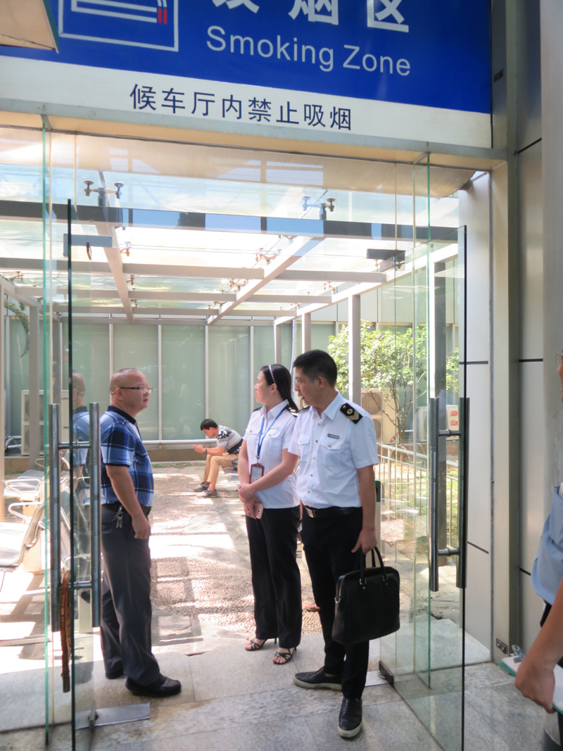卫生执法人员现场检查交通客运站内禁烟工作情况