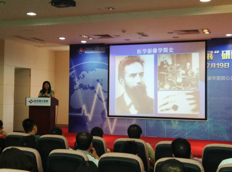 图为郑晓林博士在东莞康华医院会议厅上为学员讲授放射卫生防护工作要点