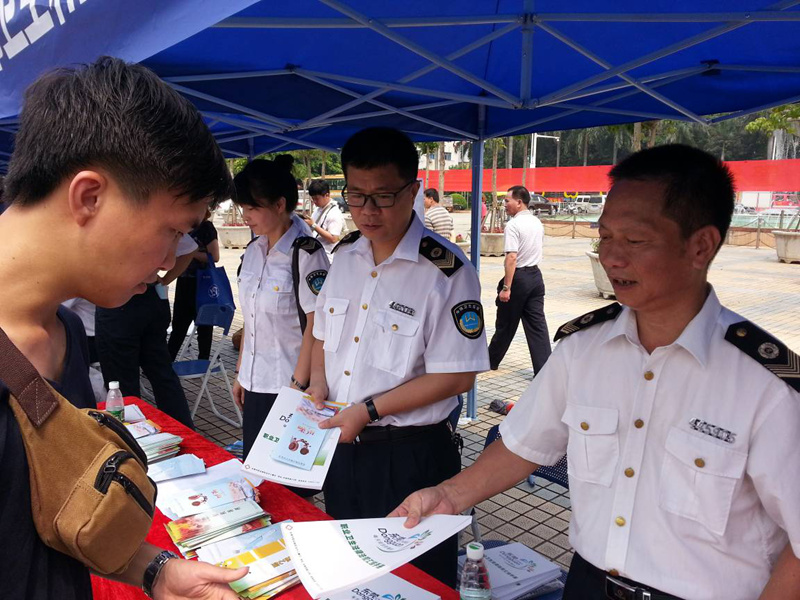 图为市卫生监督所卫生监督员在现场为群众派发宣传资料