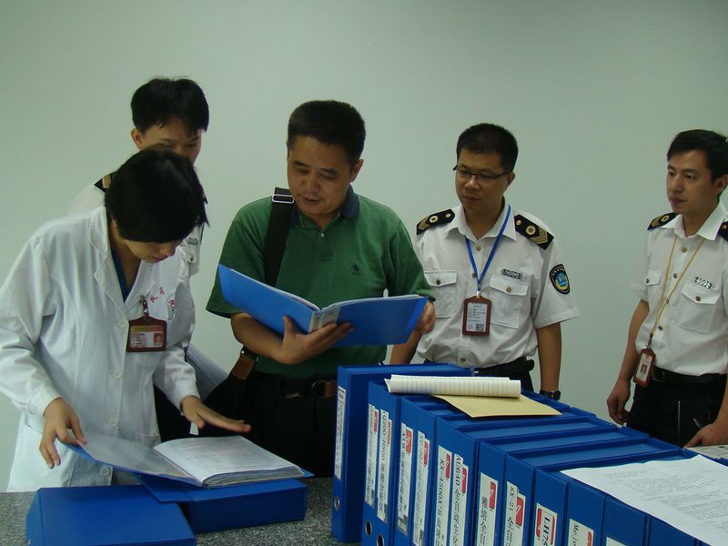 图为督查组对职业健康检查机构的实验室质控记录、盲样考核记录等资料进行询问与查阅