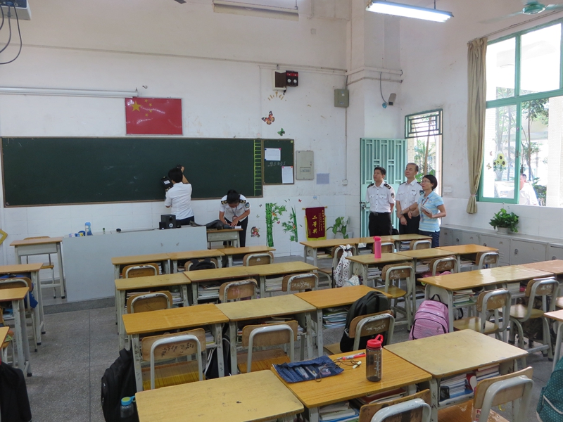 图为市卫生监督所卫生执法人员在教室开展现场快速检测。