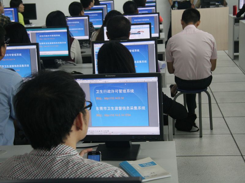 图为卫生监督员参加全市卫生监督信息采集系统及新版卫生行政许可管理系统操作培训班